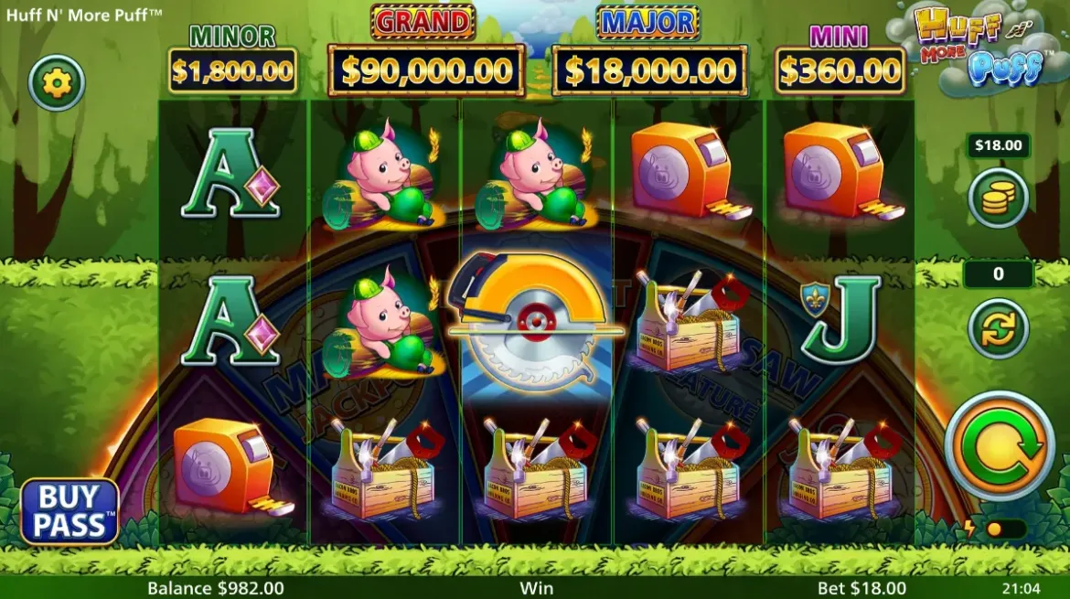 Huff N' More Puff features four fixed jackpots: Mini, Minor, Major, and Grand. These can be won either through the Buzz Saw Wheel or by revealing jackpot tokens hidden in brick or mansion houses during the free spins. The jackpots scale with your bet size, with the Grand jackpot offering up to 5,000 times your stake. The chance to win a jackpot on any spin, combined with the excitement of uncovering jackpot tokens during bonus rounds, adds an extra layer of anticipation to every session. These jackpots are a major draw for players seeking big wins and keep the gameplay fresh and rewarding.